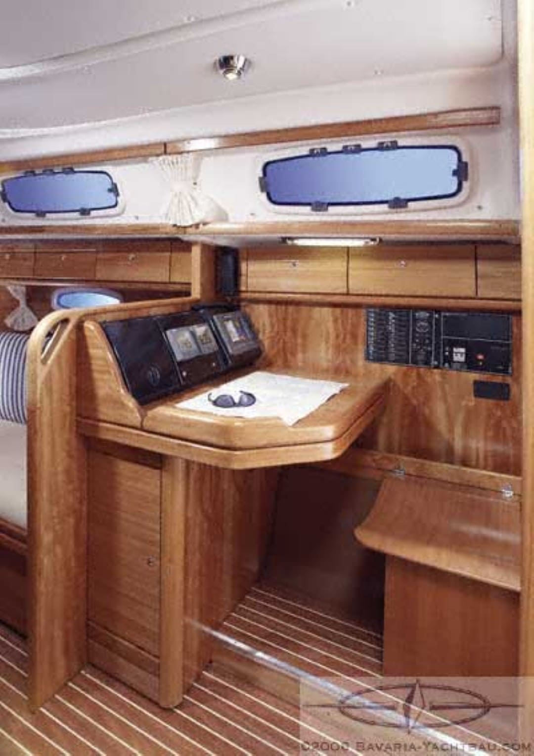Navigation:Kompass, Echolot, Logge, Windex, UKW-Seefunk mit DSC, Kartenplotter, Hafenhandbücher, Seekarten, Navigationsbesteck, Fernglas, elektr. Windmessanlage, Handpeilkompass, Autopilot, AIS