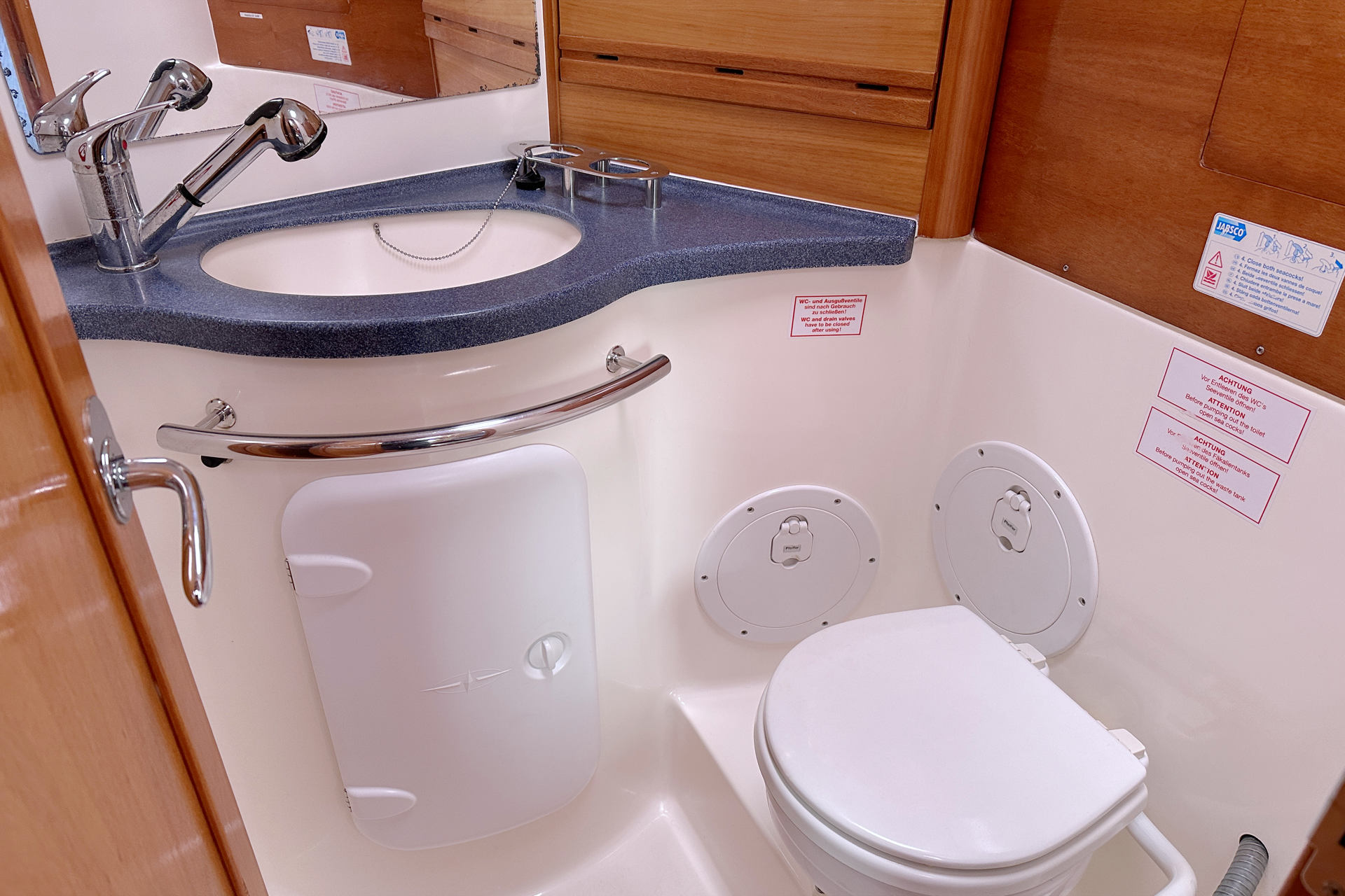 Pantry:2-3-flammiger Gasherd, Backofen, elektrische Kühlbox, Druckwasseranlage mit Zapfstellen in Pantry und WC, Spülbecken in der Pantry, Geschirr, Bestecke, Töpfe, Pfannen, Wasserkessel, Thermoskannen und Haushaltsgeräte. Handtücher, Lappen und Spülmittel aus hygienischen Gründen nicht! Zum Kaffeekochen Filtereinsatz (1x4, Filtertüten mitbringen!)