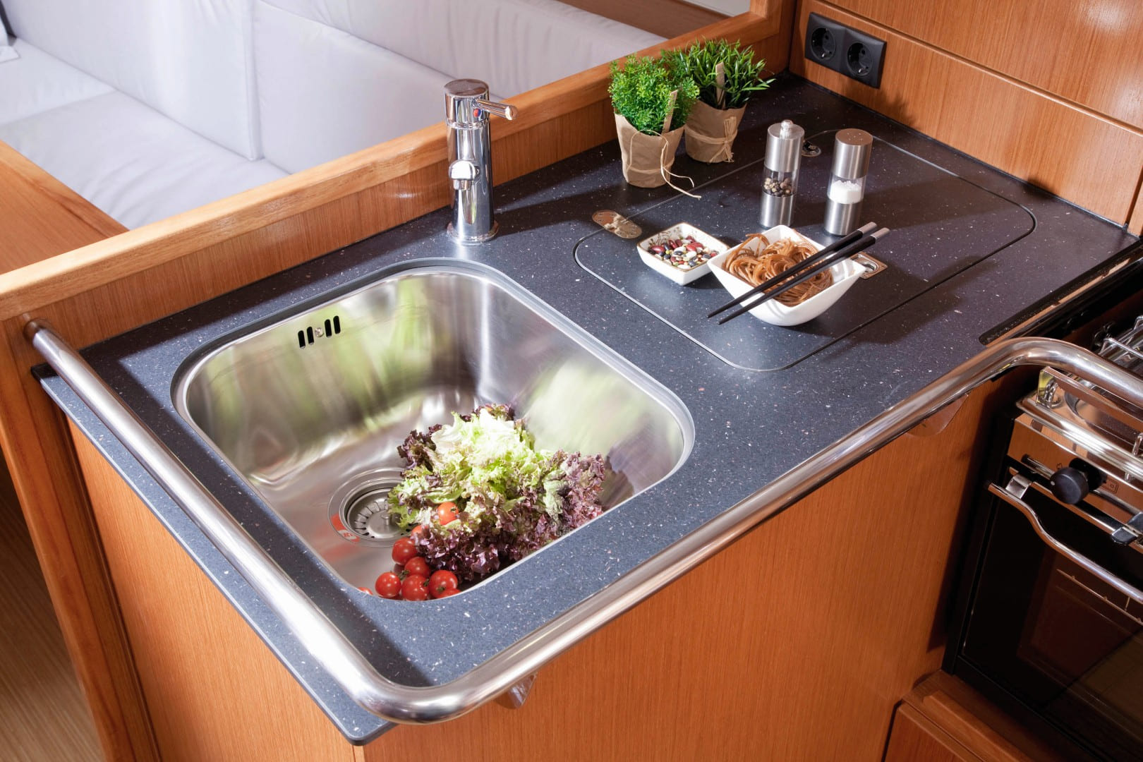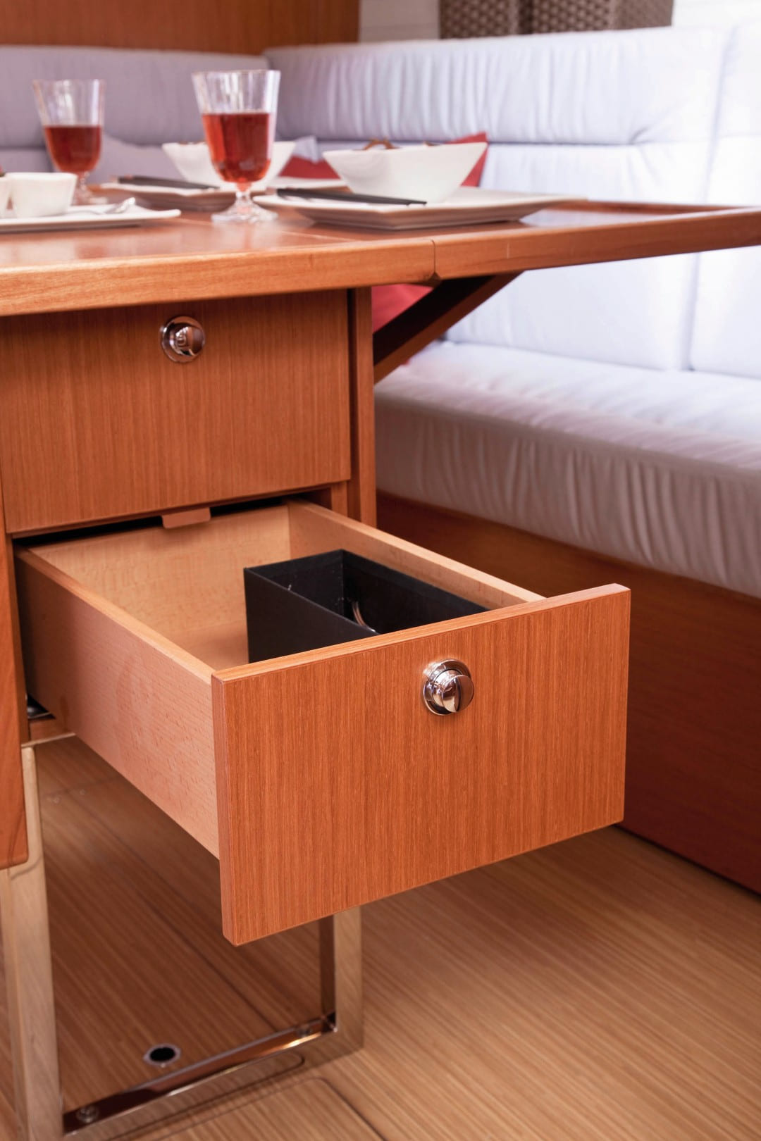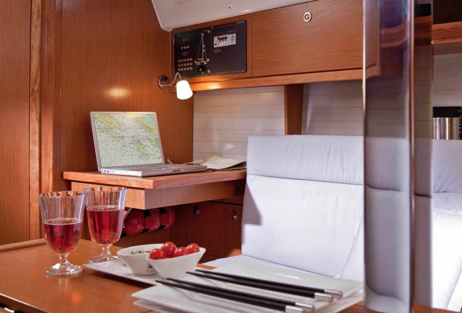 Navigation:Kompass, Echolot, Logge, Windex, UKW-Seefunk mit DSC, Kartenplotter, Hafenhandbücher, Seekarten, Navigationsbesteck, Fernglas, elektr. Windmessanlage, Handpeilkompass, Autopilot