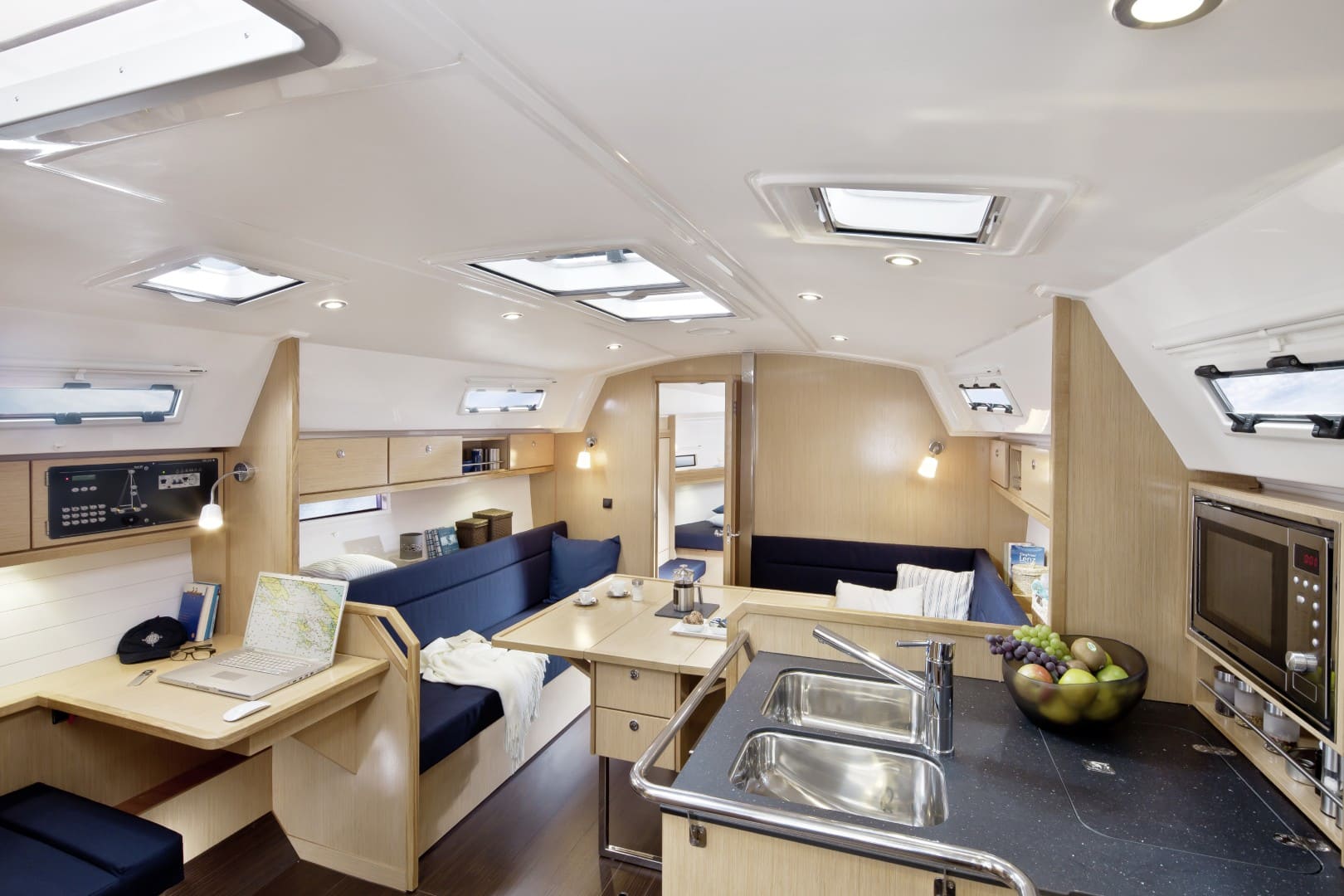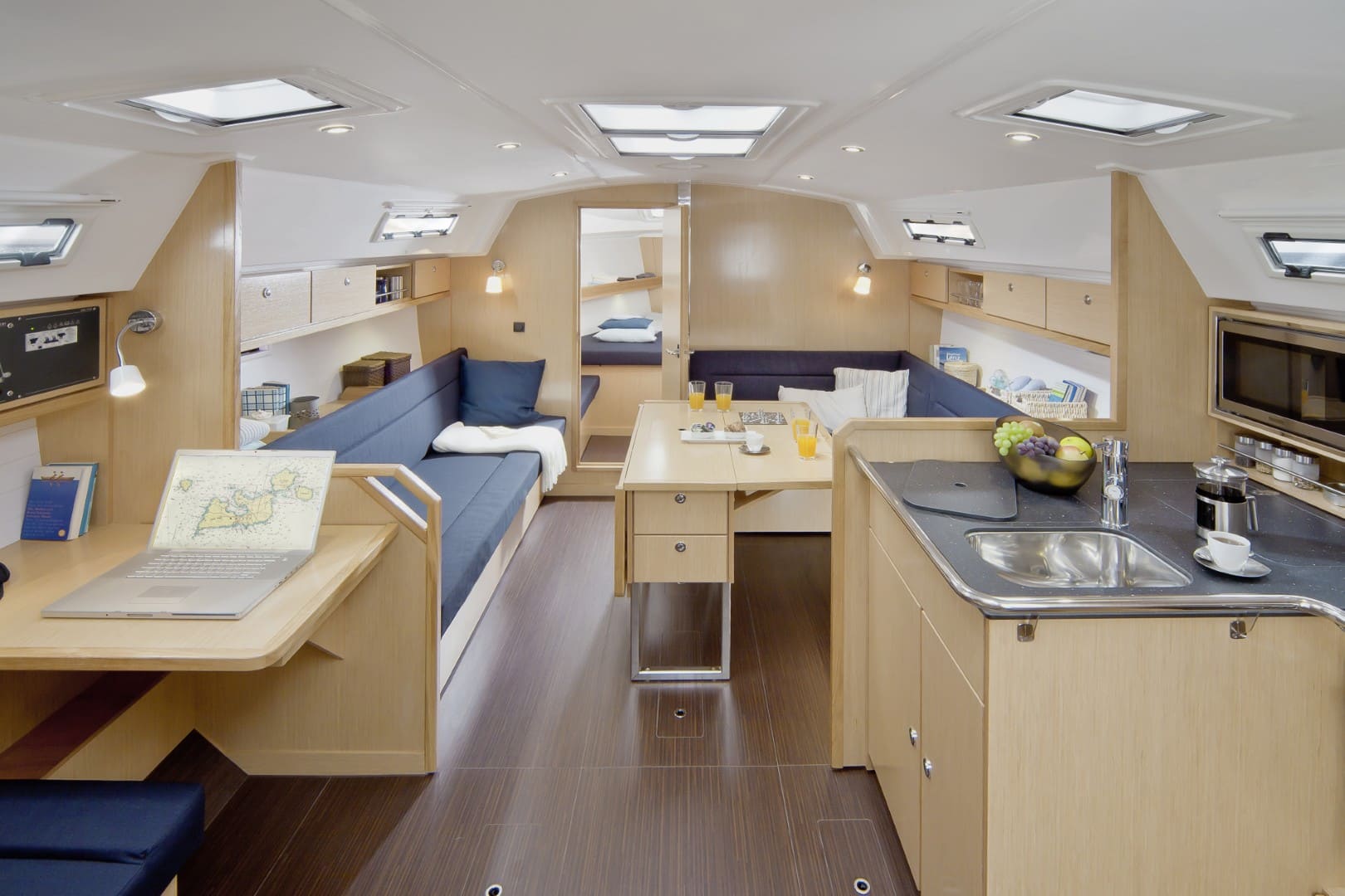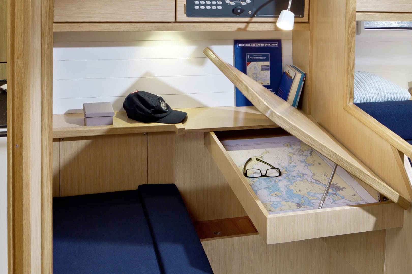 Navigation:Kompass, Echolot, Logge, Windex, UKW-Seefunk mit DSC, GPS-Kartenplotter im Cockpit, Handpeilkompass, Seekarten, Hafenhandbücher, Navigationsbesteck, Fernglas, Autopilot