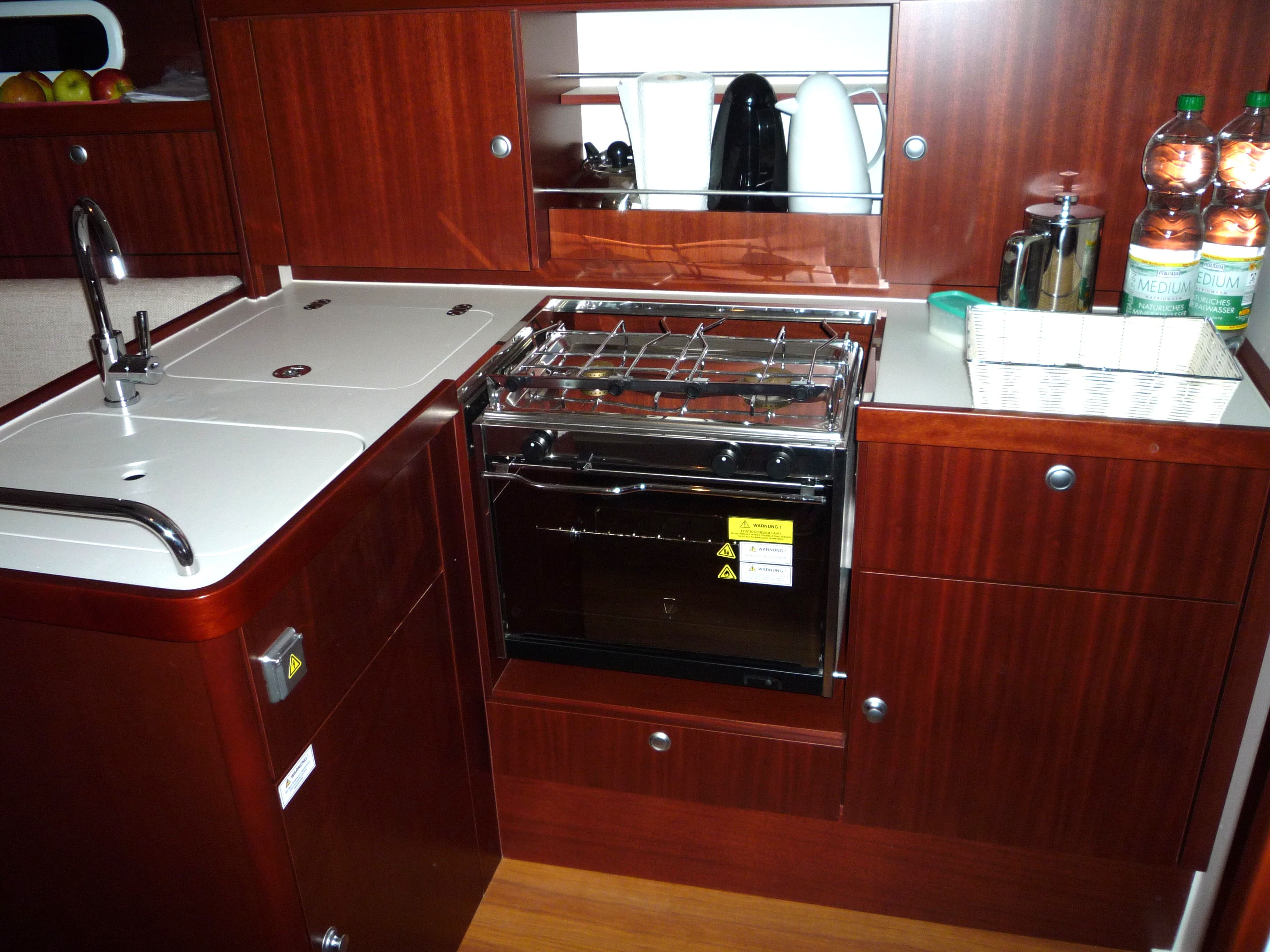 Pantry:Gasherd mit Backofen, Spülbecken, Warmwasser, Kühlschrank, Pött und Pann