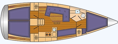 Weiteres:Fender, Festmacher, Bordwerkzeug, Bootshaken, Heizung, Sprayhood, Radsteuerung, durchgelattetes Großsegel mit Lazybag, Selbstwendefock