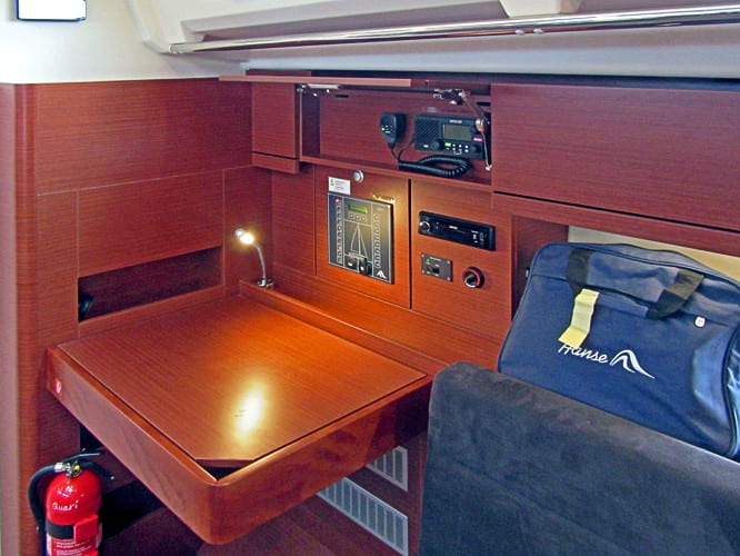Navigation:Kompass, Echolot, Logge, Windex, UKW-Seefunk mit DSC, Kartenplotter im Cockpit, Seekarten, Hafenhandbücher, Navigationsbesteck, Autopilot, Windmessanlage, AIS