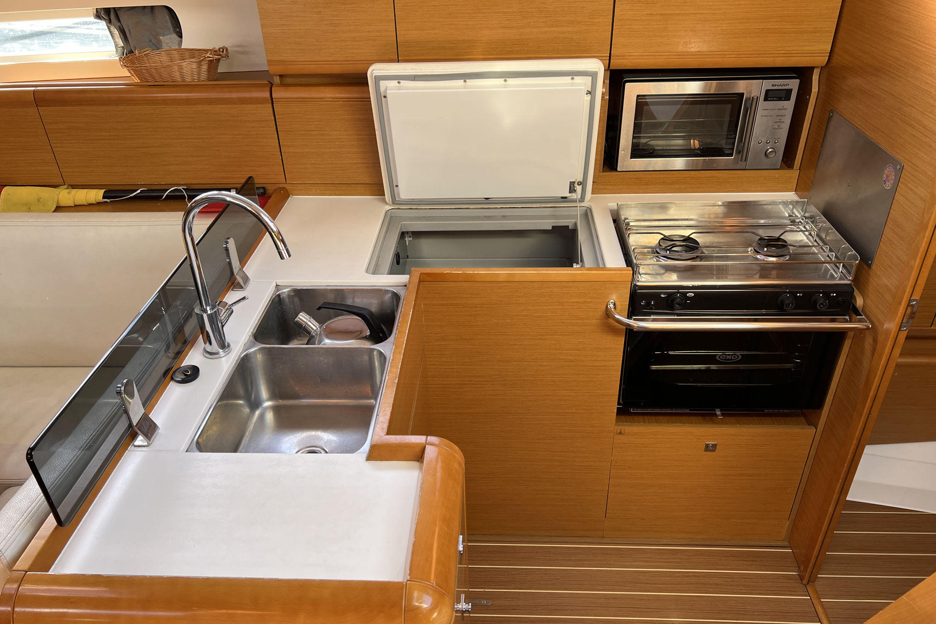 Pantry:2-3-flammiger Gasherd, Backofen, elektrische Kühlbox, Druckwasseranlage mit Zapfstellen in Pantry und WC, Spülbecken in der Pantry, Geschirr, Bestecke, Töpfe, Pfannen, Wasserkessel, Thermoskannen und Haushaltsgeräte. Handtücher, Lappen und Spülmittel aus hygienischen Gründen nicht! Zum Kaffeekochen Filtereinsatz (1x4, Filtertüten mitbringen!)